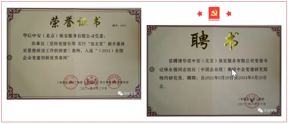 今年以来,在上级党委的关心领导下,在集团董事长殷卫宏同志支持帮助下,华信中安党委以建党100周年为契机,紧紧围绕集团发展规划加强党的建设,开展党建活动,取得了突出成效。党委报送的"双争双先"党建品牌被树为北京市"党建强发展强"100个党建品牌项目;华信中安党委《坚持党建引领,实行"双主官"制,开展保安思想政治工作的探索》入选全国企业党建创新优秀案例,党委书记林永强被中国企业党建研究院聘为特约研究员,成为全国首批6名特约研究员之一。