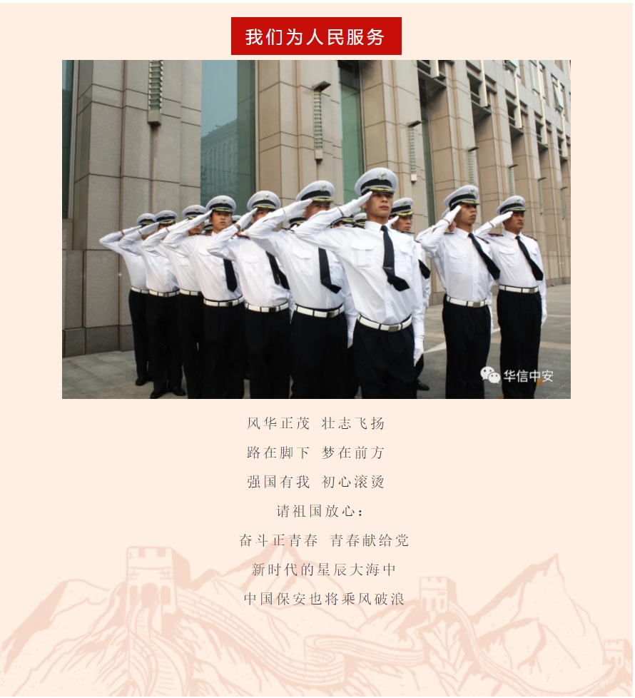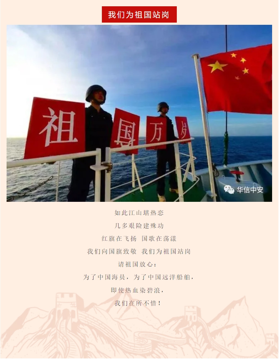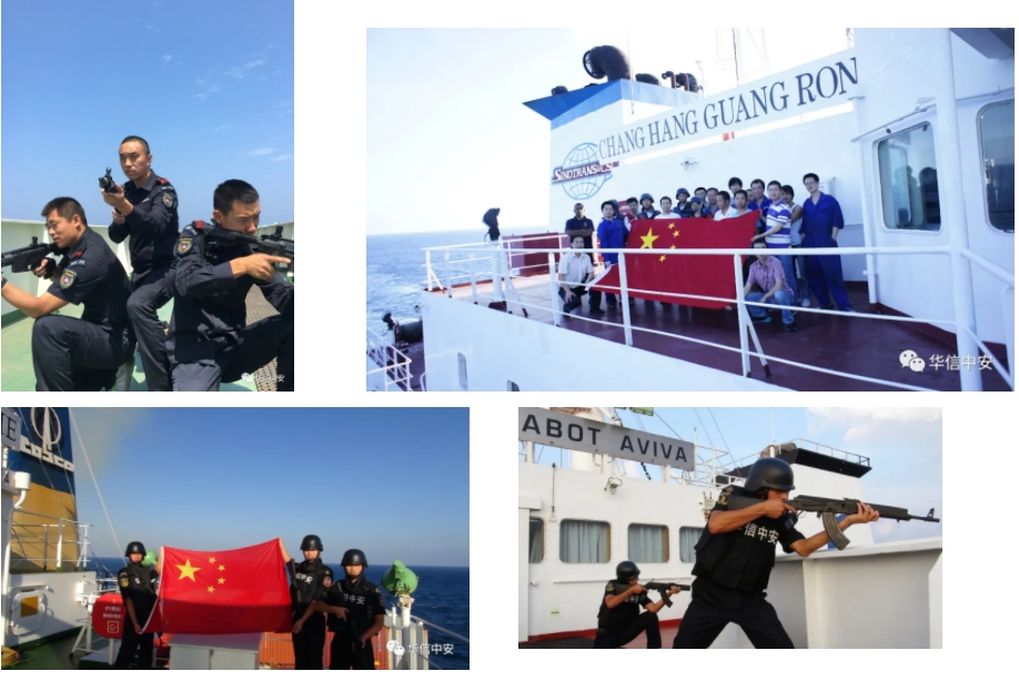 中国的脚步走到哪里,中国的保护就跟到哪里,面对中国公民和驻外机构在海外巨大的安保需求,华信中安作为率先走出国门的保安公司,肩负起维护我国驻外机构和企事业单位安全、为中国的海外利益保驾护航是我们义不容辞的责任。节日期间,华信中安安海上武装护航总队、海外陆地安保队员,在世界的每一个角落,为祖国站岗,坚定不移的为祖国的海外利益保驾护航。