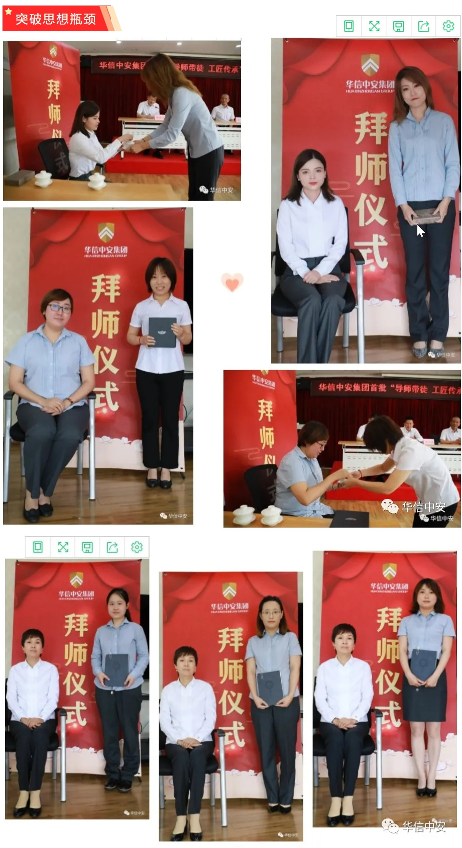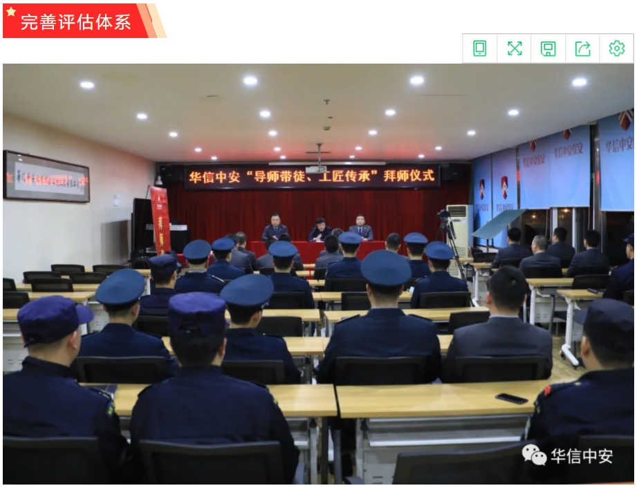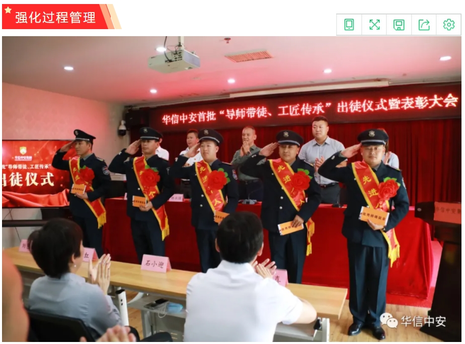 工匠精神的培育事关企业的可持续发展,华信中安打造百年品牌,不仅需要企业经营者前瞻性的眼光来确立发展方向,同时也依赖于一批又一批的优秀人才将企业文化薪火相传。在师徒制推进的过程中,华信中安紧紧围绕企业业务发展和品牌建设,让工匠精神厚植企业的文化土壤,在企业内部构建更为科学合理的培训体系,将 "导师带徒 工匠传承"管理制度在机关同步推行,使工匠精神融入员工的在职教育中,引导全体员工树立正确的价值取向。