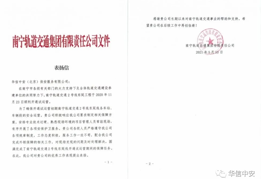 2021年5月13日,南宁轨道交通集团有限责任公司再次向华信中安发来表扬信,南宁地铁2号线东延过程中,为保障2号线东延线各车站、车辆段的安全运营,华信中安南宁分公司在地铁试运营期间积极响应轨道交通集团要求,制定相关保障方案,安排专业技术过硬、熟悉现场环境的项目管理人员常驻现场,有序开展各项安保护卫工作。华信中安各级负责人严格遵守南宁轨道交通集团各项管理制度,工作态度积极,服务一丝不苟,配合南宁轨道交通集团完成多项外联保障工作任务,对现场发现问题及时处理解决,圆满完成了南宁地铁2号线东延开通试运营期间的安全保障任务。南宁轨道交通集团特此对华信中安南宁分公司的出色工作表现提出表扬。