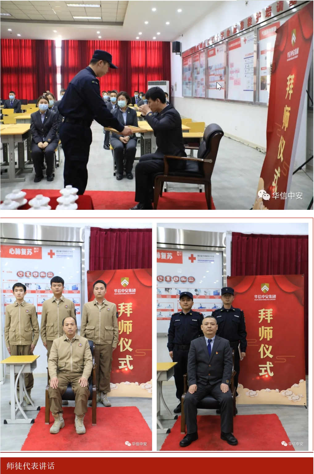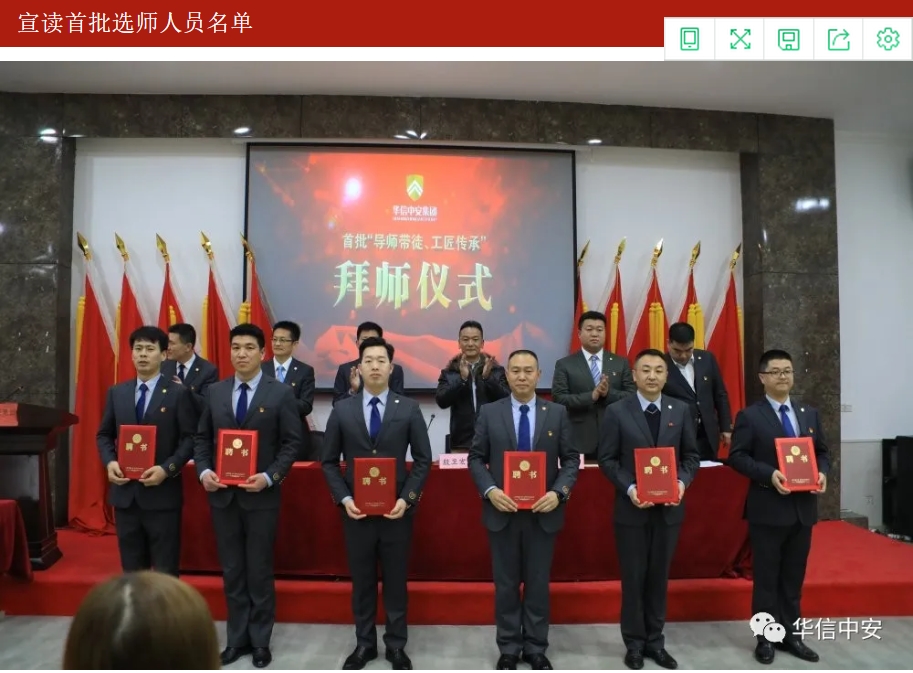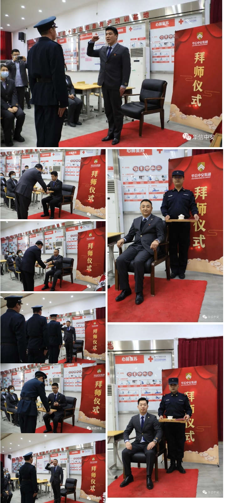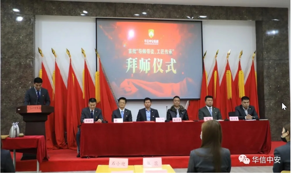 备一盏清茶,送一个红本,从此之后,悉心教导,毫无保留。拜师仪式正式开始,师傅分别向徒弟承诺:"将我所学、尽我所能,毫无保留,传授给你,希望你好好学习,早日出徒,成为华信中安不可缺少的一员"徒弟也向师傅保证:虚心求教,争分夺秒,把您所授,运用到工作生活之中。" 礼毕,师徒关系正式确立。师徒关系的确立既是一种深厚感情也是一份文化传承,饮其流者怀其源,学其成时念吾师。