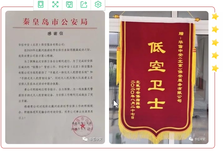 此次北戴河暑期安全保障任务,安保级别高,时间跨度长、活动地点多、保障难度大,对我们工作提出了巨大的挑战。在长达50多天的任务中,我方安保人员、技术工程师发扬特别能吃苦、特别能战斗的精神,克服现场值勤中的各种困难和不良天气的影响,时刻保持良好的工作状态,全程监控,密切配合,忠于职守。期间共发现和处置无人机起飞10余起;在安保指挥部不打招呼、不定时间、不定地点、不限机型的无人机侦测反制实兵对抗演习中,我方防御阵地第一时间发现、第一时间上报,第一时间处置,受到了安保指挥部的高度表扬。公安部多位领导先后到我防御阵地进行视察,对无人机防御反制值勤工作给予了充分肯定,并叮嘱大家严防死守,确保防卫目标的绝对安全。勤务结束后,秦皇岛市公安局专门为公司制作了"低空卫士"锦旗,并发来感谢信,以表彰华信中安无人机技术大队在此次勤务中的良好表现!