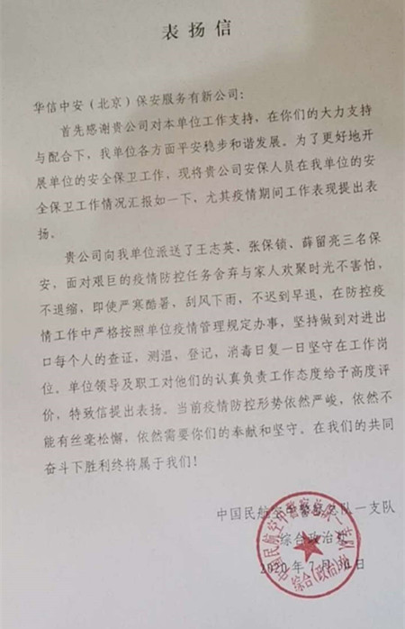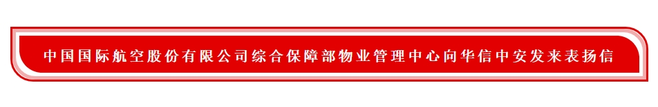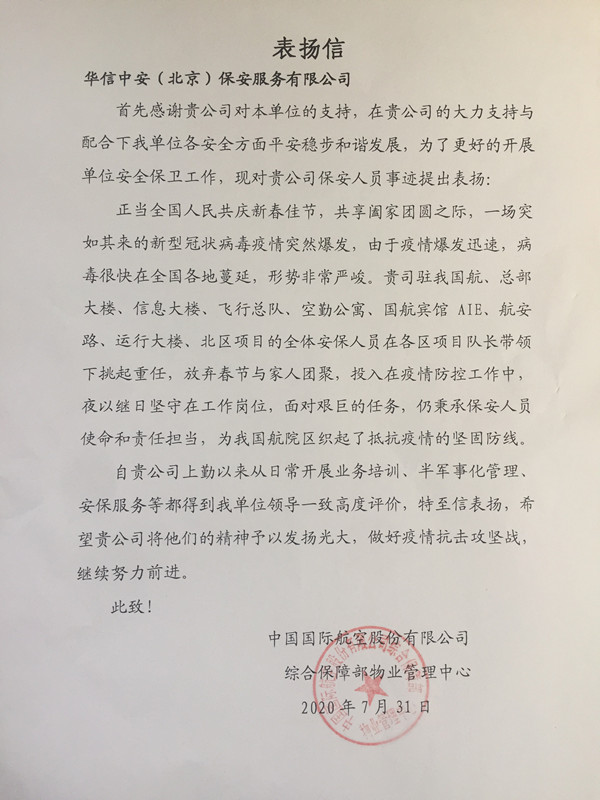2020年7月31日,中国国际航空股份有限公司综合保障部物业管理中心向华信中安发来表扬信,对华信中安驻中国国际航空股份有限公司国航、总部大楼、信息大楼、飞行总队、空勤公寓、国航宾馆AIE、航安路、运行大楼、北区项目的全体保安队员,在各项目队长的带领下勇挑重任,放弃与家人团聚,投入到疫情防控工作中,夜以继日坚守在工作岗位,不忘担当不辱使命,为国航院区织起抵抗疫情的坚固防线提出表扬,同时希望驻勤队伍继续坚持自上勤以来半军事化管理的优良作风,为抗疫攻坚战取得全面胜利继续努力。