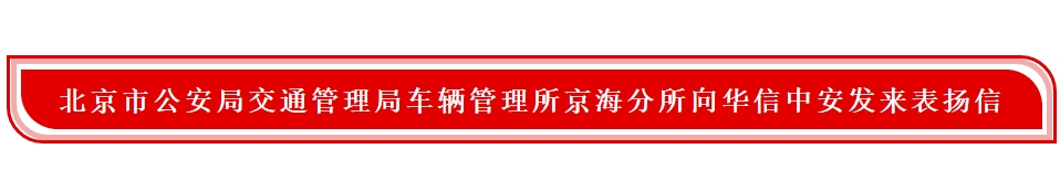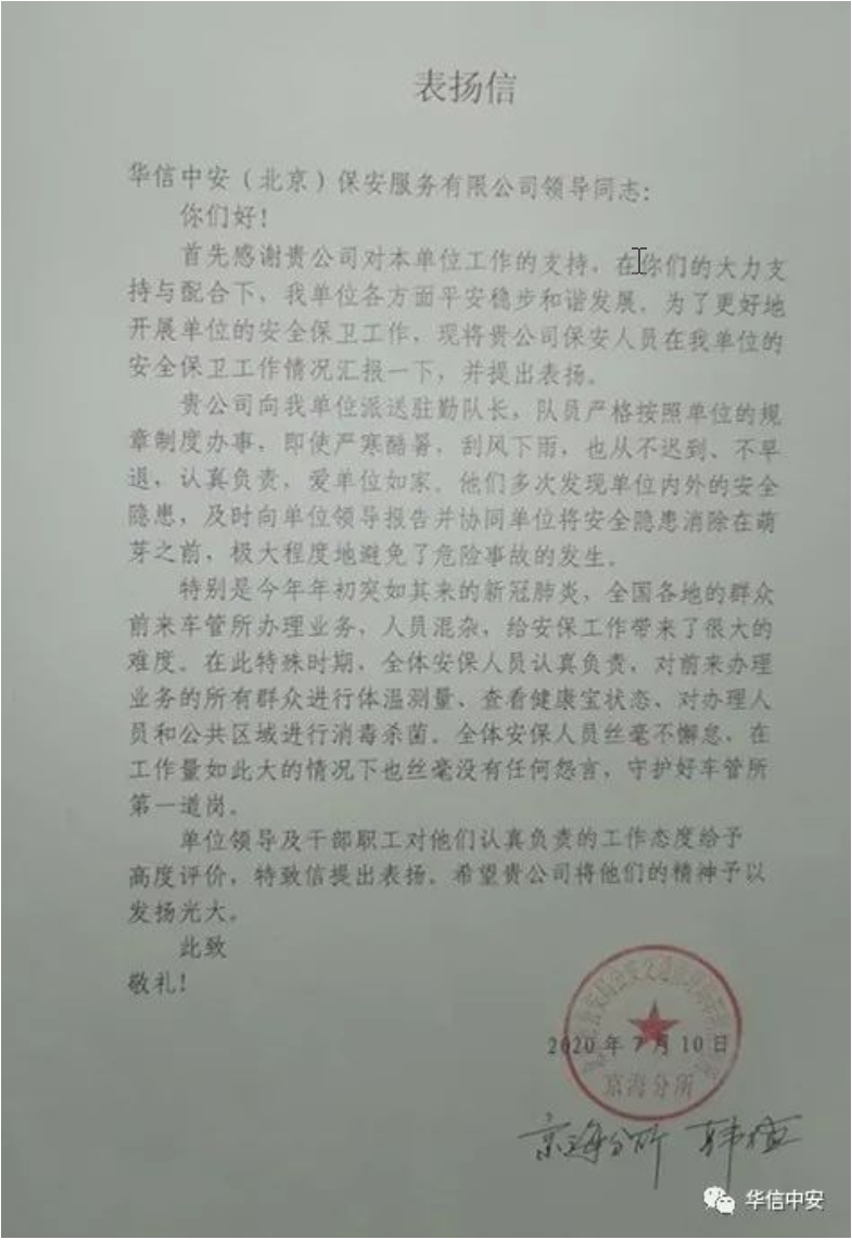 2020年7月10日,北京市公安局交通管理局车辆管理所京海分所向华信中安发来表扬信,向华信中安驻车辆管理所京海分所保安队爱所如家,认真负责,多次在工作中发现单位内外安全隐患并将隐患消灭在萌芽之中的出色表现提出表扬。特别是今年新冠疫情爆发以来,全国进京车辆前来车管所办理业务,给保安工作带来了很大的困难。在这特殊时期,华信中安全体驻勤保安队员挺身而出任劳任怨的肩负起了外来人员登记测温,健康状态确认,公共区域消杀等各项工作,为车管所筑起了一道坚实的安全屏障。车辆管理所特此向华信中安发来表扬信,对华信中安驻北京市公安局交通管理局车辆管理所京海分所保安队提出表扬。