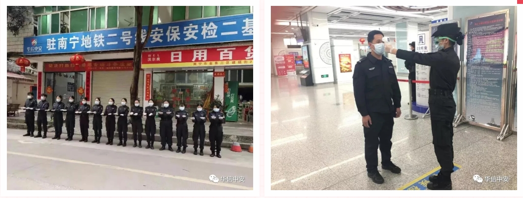 华信中安南宁地铁二号线始终高度重视重大活动期间安全维稳工作。提升政治站位、加强思想动员、成立专门领导小组、落实各级文件精神、组织召开部署会议,先后出色完成"十九大"两会"东盟博览会"广西壮族自治区成立60周年庆典"等重大活动安保攻坚战。去年底,新型冠状病毒爆发以来,华信中安南宁分公司驻南宁地铁二号线保安员始终战斗在防疫第一线,肩负南宁地铁2号线安保安检任务,担负着地铁最直接的疫情防控工作,华信中安南宁地铁二号线全体队员们分工明确各司其职,坚守在大家出行的路上。为疫情期市民出行筑起了一道安全屏障,确保了广大乘客的生命财产安全。