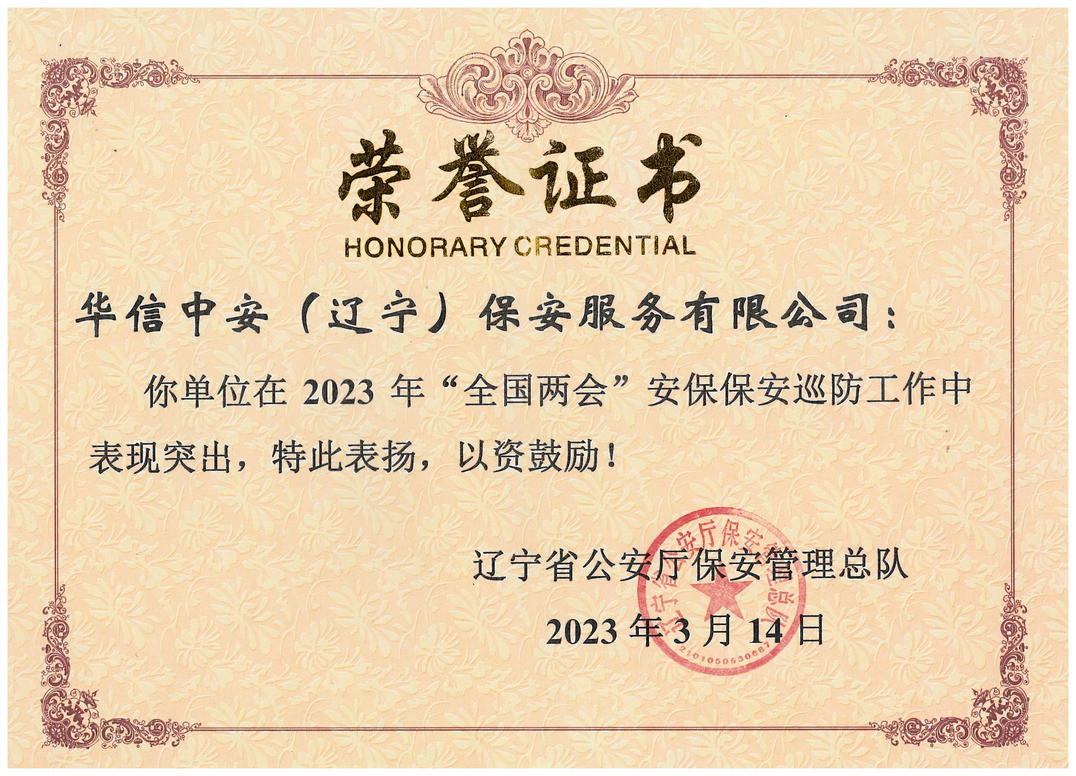 特此辽宁省公安厅保安管理总队于2023年3月14日为华信中安(辽宁)保安公司颁发荣誉证书,对华信中安(辽宁)保安公司在2023年“全国两会”保安巡防工作给予了高度认可和表扬!